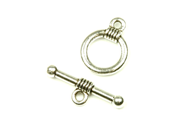 Americké zapínání z bižuterního kovu a v povrchové úpravě v barvě starostříbra. Zapíná se prostrčením tyčinky kroužkem, která se následně o kroužek zasekne a zapínání tak velmi dobře drží.