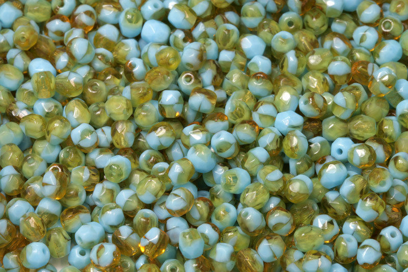 Tyto broušené ohňovky o velikosti 4 mm jsou vyrobeny z kombinovaného skla s odstíny sytá tyrkysová a transparentní topaz.