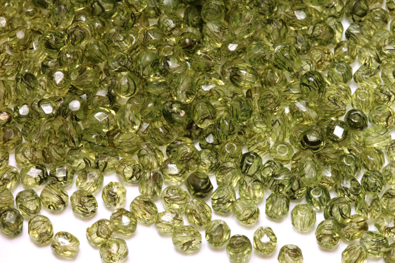 Tyto broušené ohňovky o velikosti 4 mm jsou vyrobené ze speciálního skla z názvem želvovina, korálky jsou transparentní zelené v odstínu olivín s černými linkami v hmotě skla.