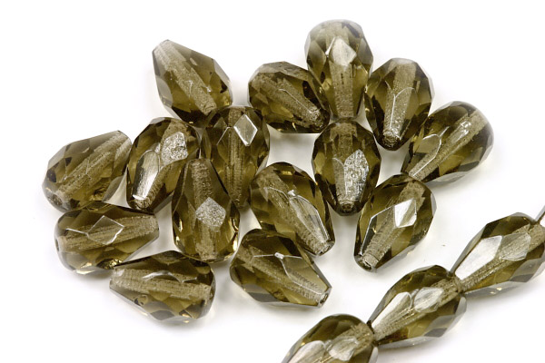 České skleněné korálky ve tvaru broušené hrušky o velikosti 10x7 mm jsou vyrobené z transparentního kouřově šedohnědého skla odstínu black diamond (40020).