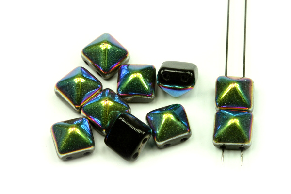 Dvoudírková pyramida, beadstud 8x8 mm, 10 ks - modrozelený duhový půlpokov na černé