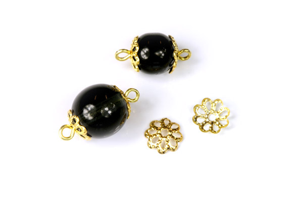 Drobné filigránové kovové kaplíky ve zlaté povrchové úpravě mají průměr 7 mm, hodí se na dozdobení korálků. Kaplíky této velikosti jsou vhodné na korálky o průměru 8 mm (na obrázku jsou na hlavách andílků) a větší (černé korálky na přiložené fotce mají průměr 8 a 10 mm).