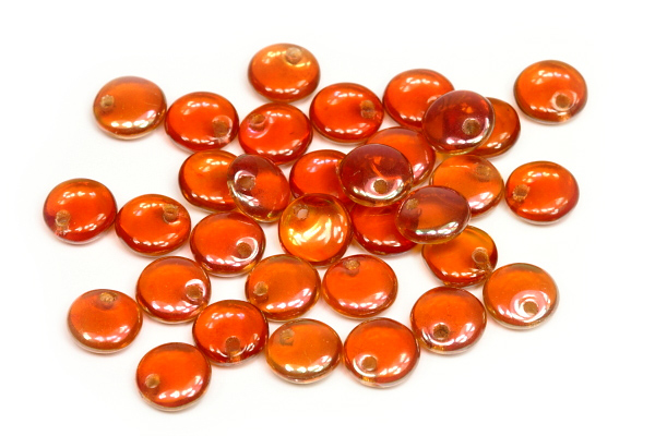Mačkané korálky ve tvaru čočky o průměru 6 mm a tloušťce cca 2,5 mm. Dírka je umístěna asymetricky u okraje korálku, takže je ideální pro použití jako visátko do jakéhokoliv korálkového výrobku.