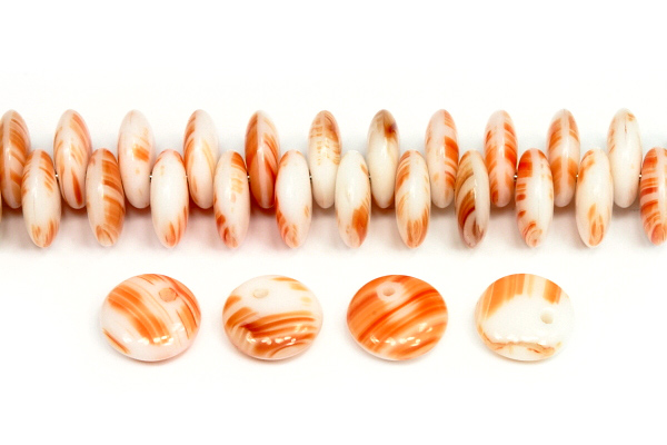 Mačkané korálky ve tvaru čočky o průměru 8 mm a tloušťce cca 3 mm. Dírka je umístěna asymetricky u okraje korálku, takže je ideální pro použití jako visátko do jakéhokoliv korálkového výrobku.