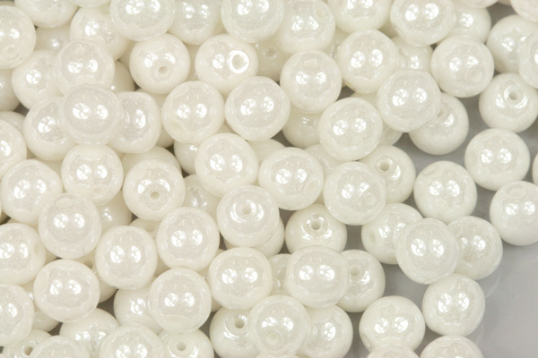 Tyto skleněné mačkané korálky ve tvaru kuliček o průměru 6 mm jsou vyrobené z bílého alabastrového skla s bílým listrem.