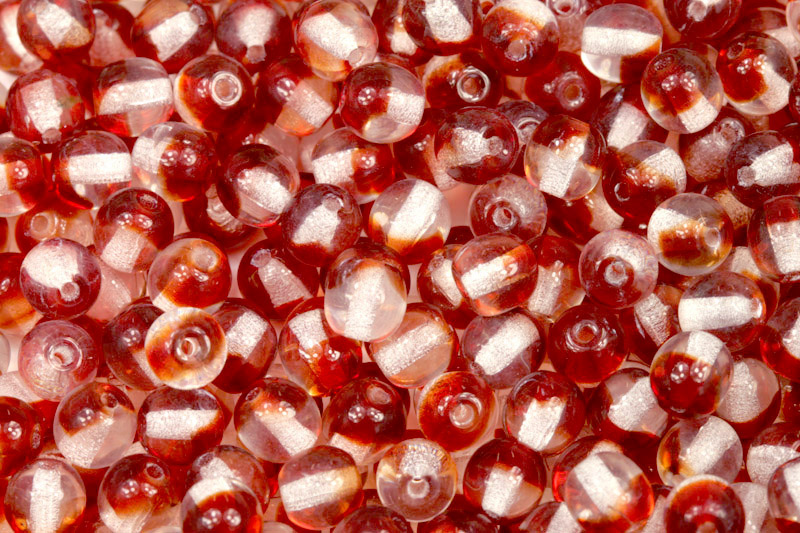 Tyto skleněné mačkané korálky ve tvaru kuliček o průměru 6 mm jsou vyrobené z kombinovaného skla v čiré a transparentní červené barvě.