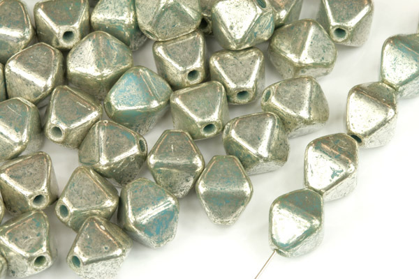 Korálky lucerny ze sytého tyrkysového skla se stříbrným terracottovým listrem o rozměrech cca 8x8 mm. Délka korálku v místě průvleku je 10 mm.