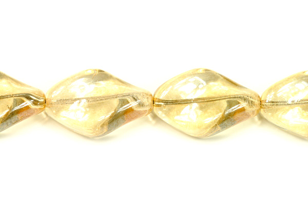 České skleněné mačkané korálky ve tvaru stáčeného oválu, vrtule o velikosti 19x13 mm. Jsou vyrobeny z čirého krystalového skla s béžovým listrem č. 14413. Tyto korálky vyrobili mačkáři ve sklárnách na Jablonecku.