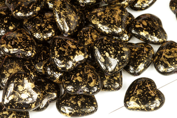 Tyto srdíčkové korálky jsou vyrobeny ze sytého černého skla se zlatým granitem. Skleněné korálky ve tvaru srdíček jsou vyrobeny v českých sklárnách na Jablonecku.