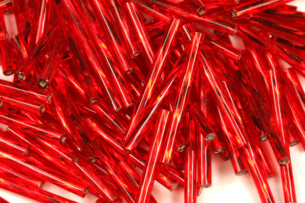 PRECIOSA Bugles-SH, stáčené čípky 11,1" (25 mm), 50 ks - červená siam, stříbrný průtah