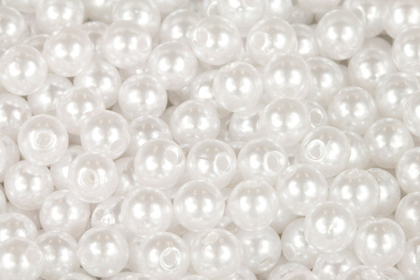 Plastové kulaté korálky o průměru 8 mm s perleťovou povrchovou úpravou imitují perly.