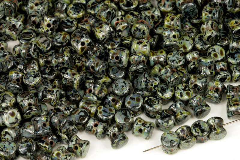 Mačkané korálky PRECIOSA Pellet™ v povrchové úpravě travertin (86805) na sytém černém skle (23980).