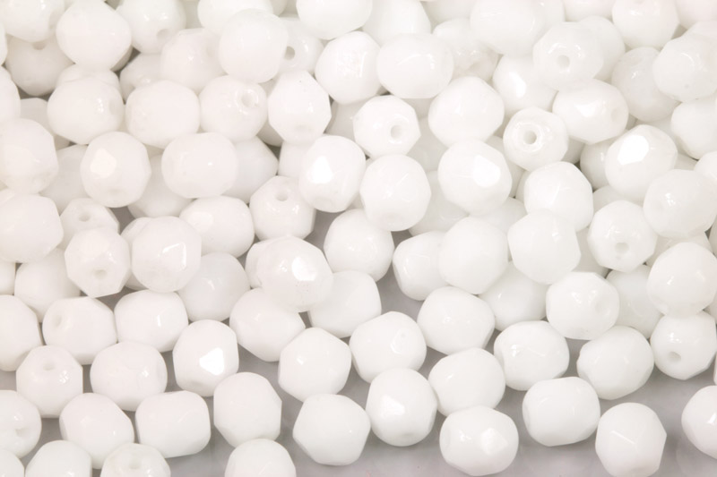 Broušené korálky ohňovky o velikosti 6 mm jsou vyrobené z alabastrově bílého skla (02010).
