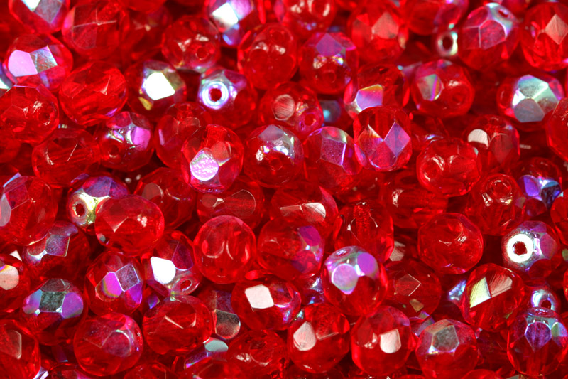 Tyto broušené ohňovky o velikosti 6 mm jsou vyrobeny z transparentního červeného skla v odstínu rubín (90090) s duhovým AB pokovem (Aurora Borealis).