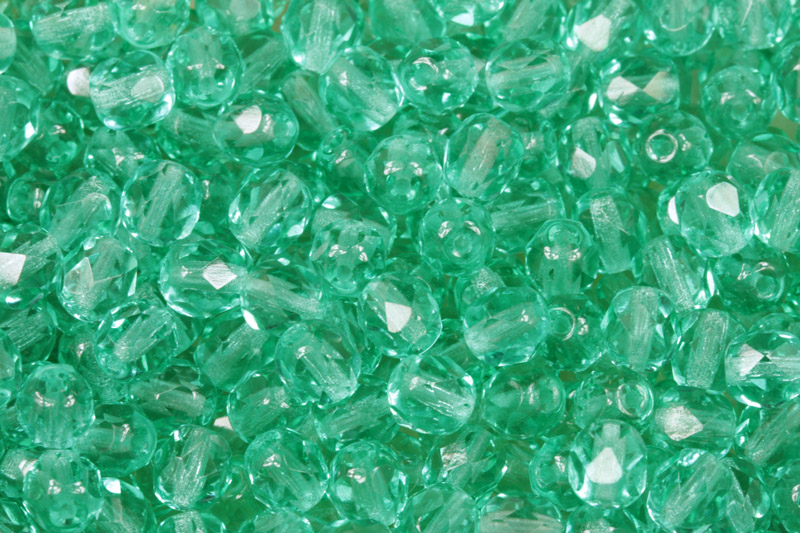 Broušené korálky ohňovky o velikosti 6 mm jsou vyrobené z transparentního modrozeleného skla v odstínu zelený akvamarín (60200).