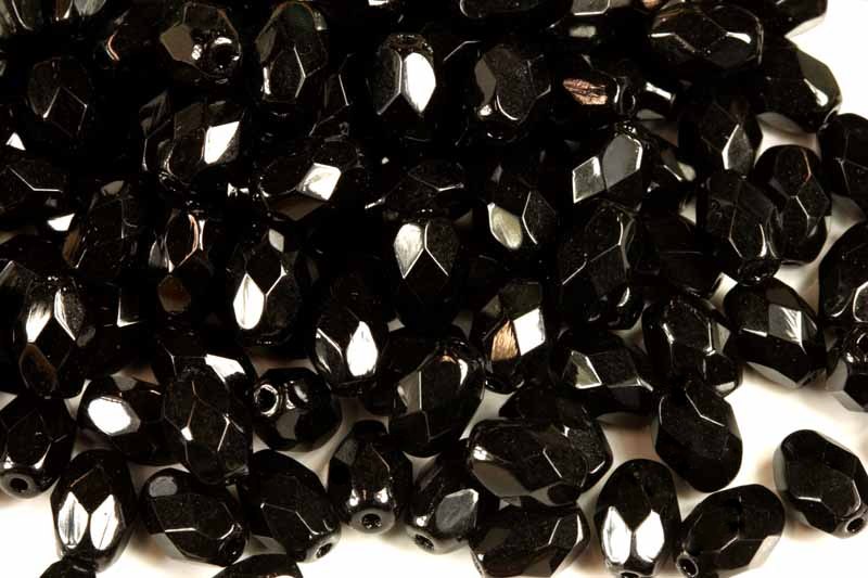České skleněné korálky ve tvaru broušené olivy o velikosti 7x5 mm vyrobené ze sytého černého skla.