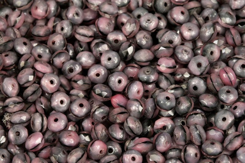 Broušené korálky o velikosti cca 3x5 mm vyrobené z měsíčního skla, které připomíná drahokam achát. Sklo je žíhané v odstínech růžové, fialové, šedé a černé.