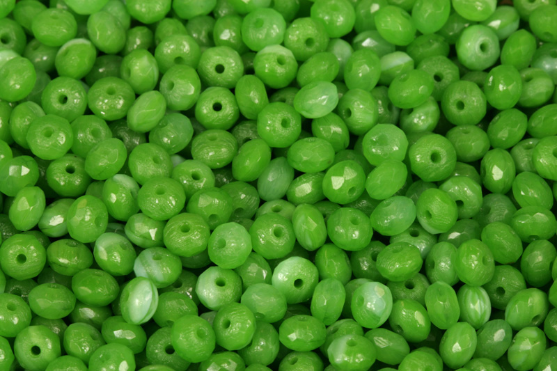 Broušené korálky o velikosti cca 3x5 mm vyrobené z kombinovaného svěže zeleného skla.