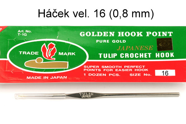 - Háček na háčkování TULIP Japan, celokovový se zlatou špičkou - tloušťka 0,8 mm (č. 16)