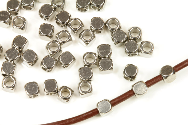 Korálky z nerezové oceli ve tvaru kostiček o velikosti 4x4x4 mm. Korálky jsou velkodírové, průměr otvoru je cca 2,6 mm a dají se navléknout i např. na hrubší šňůry a kožené řemínky.