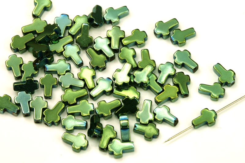 - Korálky ze syntetického hematitu, křížek 6x4 mm, 1 ks - metalická zelená