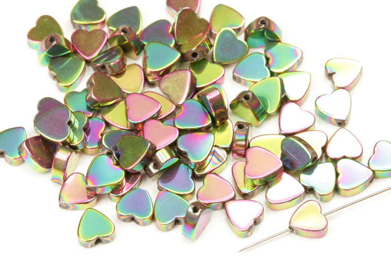 Korálky ve tvaru srdíček jsou vyrobeny z nemagnetického syntetického hematitu a pokoveny světlejším duhovým pokovem.