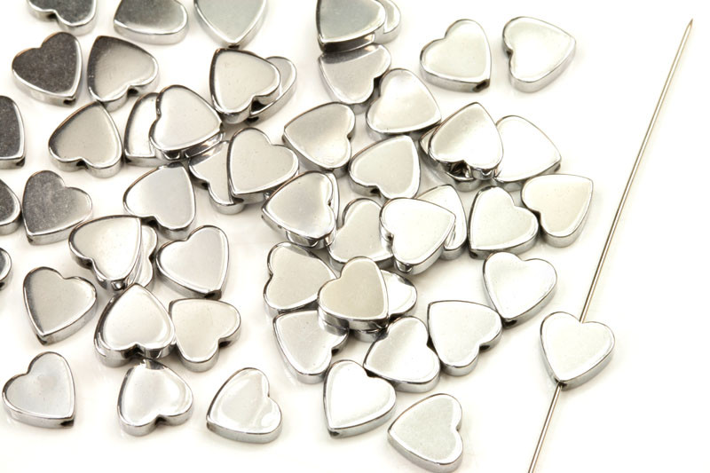Korálky ve tvaru srdíček jsou vyrobeny z nemagnetického syntetického hematitu a pokoveny ve stříbrné barvě.