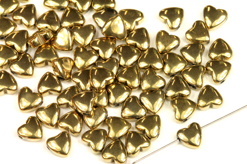 Korálky ve tvaru srdíček jsou vyrobeny ze syntetického hematitu a jsou pokoveny zlatou barvou.