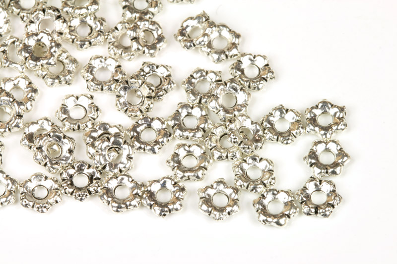 - Kovové korálky tvar rondelka kytička, mezidíl, 5,5x1,5 mm, galva starostříbro, 20 ks