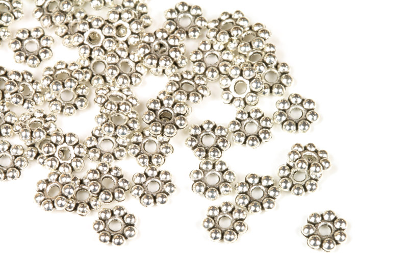 Zbobený kovový mezidílek ve tvaru kytičky, kterým ozvláštníte pružné, kožené či šňůrkové náramky z minerálů i korálků. Hodí se i pro dozdobení andílků z korálků a jiných výrobků.