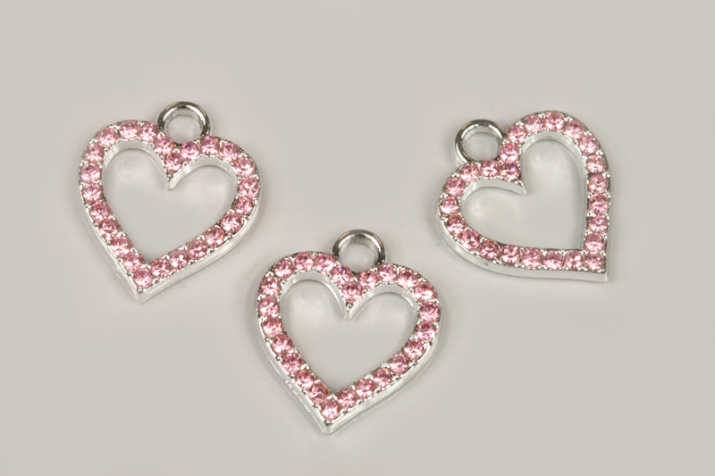 Kovový přívěsek srdíčko se šatony, galva stříbrná, růžové šatony, 1 ksSkladem20 Kč/ bal.