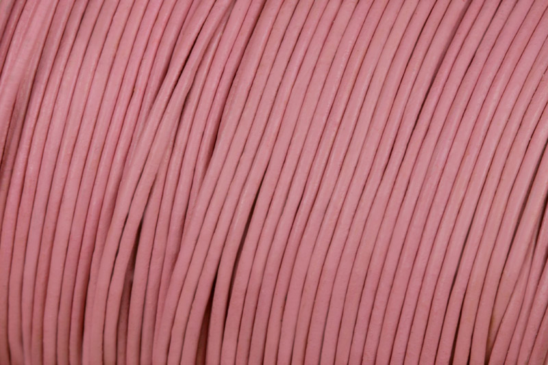 Kulatý kožený řemínek o průměru 1 mm je vyroben z hovězí kůže. Má lesklý a hladký povrch ve světlejší růžové barvě.