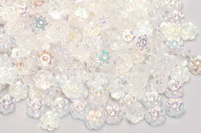 - Mačkané korálky havajské kytičky 6 mm, 20 ks - krystal, duhový dekor AB