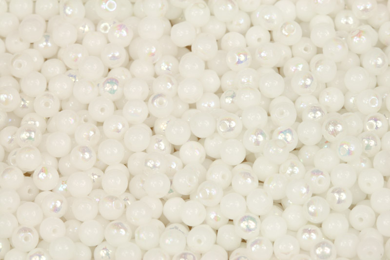 Skleněné mačkané korálky ve tvaru kuliček o průměru 4 mm. Tyto korálky jsou vyrobeny z bílého alabastrového skla s duhovým AB pokovem.