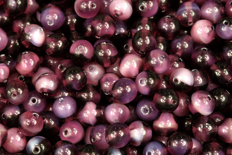 Skleněné mačkané korálky ve tvaru kuliček o průměru 6 mm jsou vyrobeny z kombinovaného skla ve fialových odstínech, žíhané provedení připomíná minerál, polodrahokam.