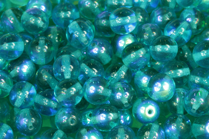 Tyto korálky jsou vyrobeny z transparentního zelenomodrého skla v odstínu zelený akvamarín a duhovým AB pokovem.