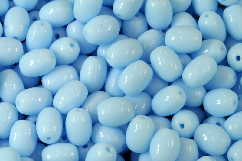 Skleněné mačkané korálky ve tvaru olivy (oválku) o velikosti 8x6 mm jsou vyrobeny ze sytého tyrkysově modrého skla (63010).