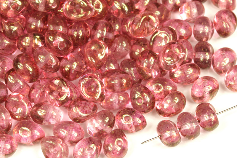 Tyto Tico beads jsou vyrobeny z čirého krystalového skla s červeným terakotovým listrem v růžovějším odstínu 15495 a vzniklyve sklárně na Jablonecku v České republice.