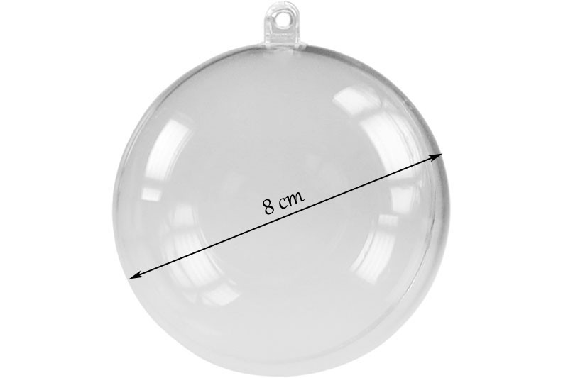 Průhledná plastová koule o průměru 8 cm je otevírací, složena je ze 2 částí, které lze spojit a pomocí očka zavěsit jako dekoraci. Dovnitř také můžete vložit drobný dáreček, sušenou kytičku, naplnit sladkostmi... Povrch baňky můžete jakkoliv dozdobit, např. potřít lepidlem a dozdobit krajkou, stuhou, glitry, posypat drobnými korálky.