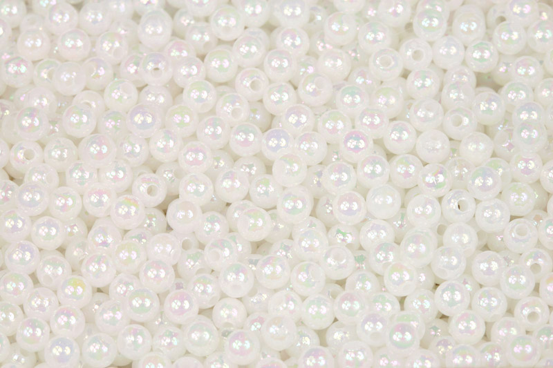Plastové kulaté korálky o průměru 4 mm s jemně duhově perleťovou povrchovou úpravou imitují perly.