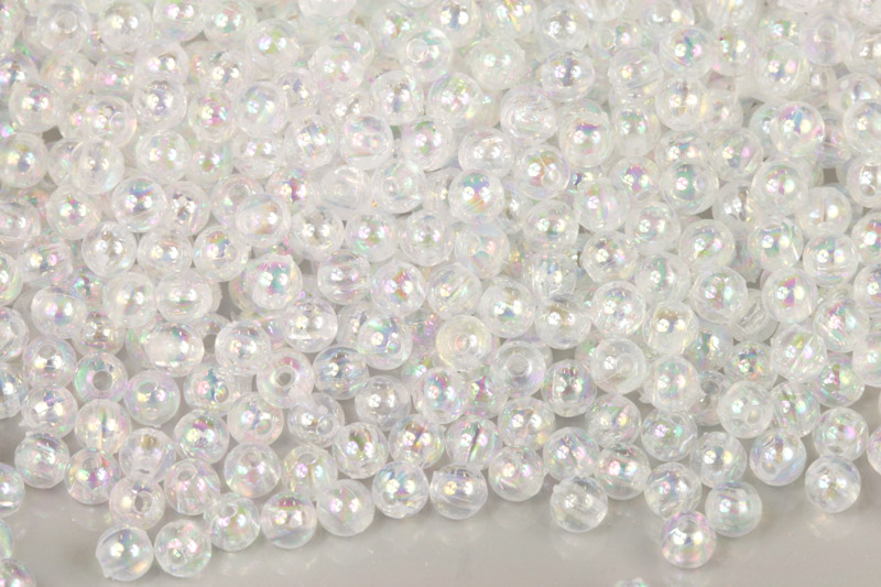 Kulaté plastové korálky o průměru 4 mm jsou čiré s duhovou povrchovou úpravou.