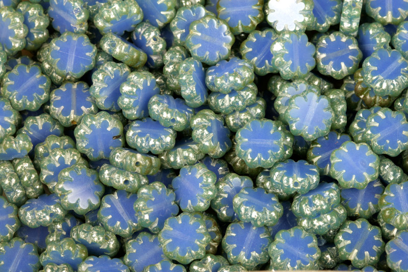 Ploškované korálky ve tvaru menších kytiček jsou vyrobeny z opálového skla v barvě safírově modrého opálu s povrchovou úpravou picasso.