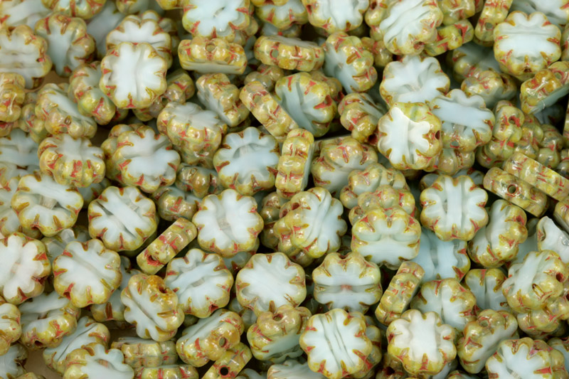 Ploškované korálky ve tvaru menších kytiček jsou vyrobeny ze světle modrého měsíčního skla s povrchovou úpravou travertin po obvodu kytičky.