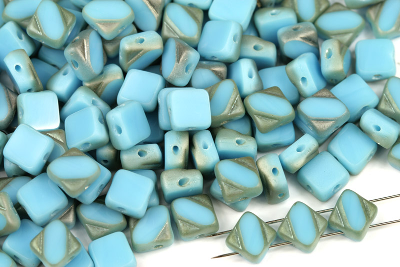 Dvoudírkový korálek Silky bead diagonal má 2 otvory v diagonálním směru, tedy uhlopříčně. Velikost Silky bead je 6x6 mm, tloušťka je cca 3,4 mm.