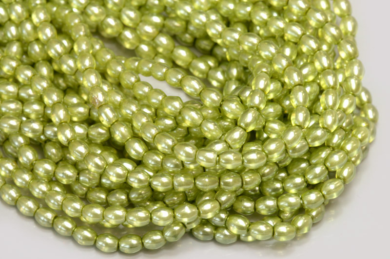 České skleněné voskované korálky (voskované či voskové perle, voskovky) PRECIOSA Traditional Beads ve tvaru drobných olivek o rozměru 4x3 mm.